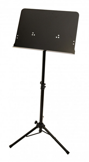 A music stand with a large, fully tiltable tray and a sturdy, foldable tripod base. This black concert-style music stand is easy to transport and travel with. Standard three-leg design with rubber feet for stability.